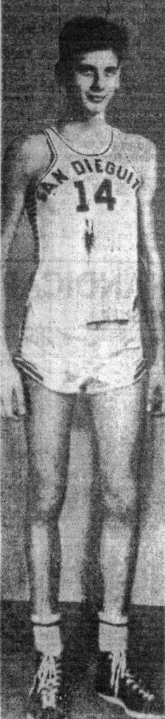 Hoover defeated San Diego, 62-38, in a game between alumni of the schools, proceeds going to financial aid at San Diego State for Cardinals and Cavers varsity players…San Dieguito won by an average score of 61-29 in running the table against Southern Prep League competition…Bill Foy of Army-Navy set a SPL individual record with 28 points in the Warriors 58-40 win over Fallbrook…Jack Goddard had 27 in Vista’s 67-22 triumph over Mountain Empire…three-year veteran Bob (Bama) Shell of St. Augustine had the highest single game scoring total of the season with 31 in a 58-36 victory over Sweetwater at Municipal Gym…season totals weren’t available but Grossmont’s Phil Embleton led Coast League scorers with 150 points in 9 games for a 16.7 average…Coronado passed on the Kiwanis Tournament but was all over the map, schedule-wise, losing to the “taller and older” U.S.S. Badoeng Strait, 50-36, defeating Naval Air, 53-50, and losing to a Tijuana high school on a court in the Baja California community…Bill Reaves, who would coach La Jolla to a 28-1 record in the 1963-64 season, was a starting guard for the Vikings…future international badminton star and NFL game official Jim Poole was a Point Loma standout….