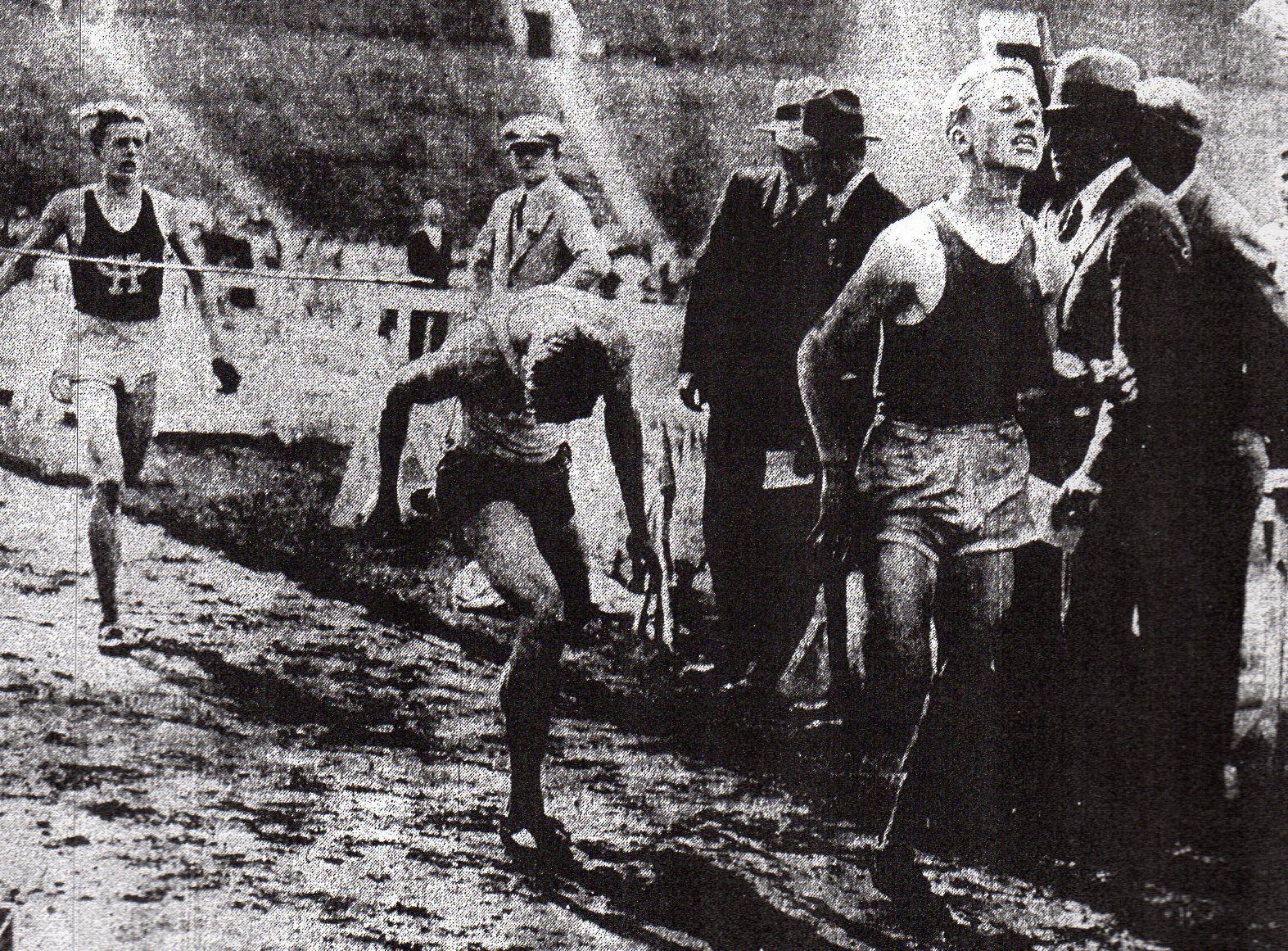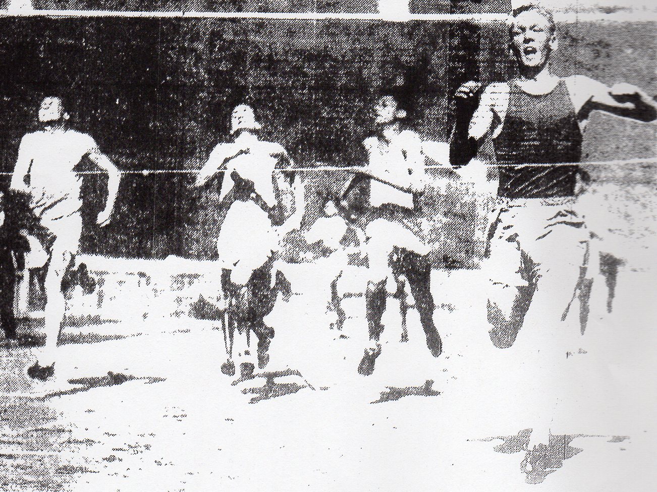 “A yard from the tape Roberts collapsed, but a fraction of a second before he stumbled across the finish line, Dowers breasted the ribbon, the winner by scant inches.