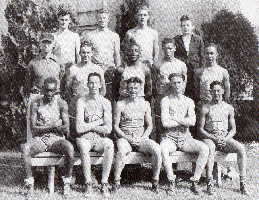 Ernie Mallory, one of the top players of the first half-century in the County, and Vance Randolph of San Diego were on the all-Southern California first team…a second-team guard was Pasadena Muir Technical’s Jackie Robinson…Point Loma coach Joe Beerkle, short of players, moved varsity standout Joaquin Qualin to Class B and Qualin scored 12 points in a 40-12 win over Army-Navy…Ramona won the Southern Prep League championship by defeating runner-up Julian, 43-8…Hoover fielded five teams, Varsity, Class B and C, junior varsity and junior varsity B…Hoover’s Class C squad nosed out Memorial Junior High,15-13…after players had dressed and departed for home it was discovered that Memorial had scored an additional two points…the teams agreed to play another game the next week…Dickie Tazlaar scored 16 as Hoover prevailed, 30-24….