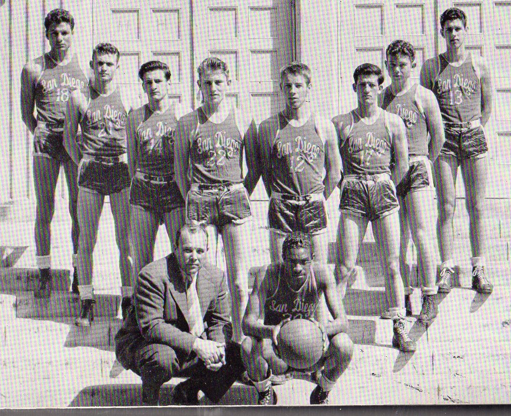 “I think we’d finish first or second with an indoor gym,” said La Jolla coach Larry Hansen, whose team was 5-3 and shared Victory League “minor division” honors with Coronado…Hoover seemed to have the officials on its side but missed 16 free throws in a 32-30 loss to the Alumni…the gulf between the good and the bad was vast…after a 46-26 loss to San Diego, Hoover turned around and defeated Vocational, 61-31…San Diego defeated Vocational, 61-17…Hoover’s late-season win over San Diego was accomplished despite the mid-term graduation loss of Don Nuttall, who had 20 points in his final game, a 32-30 win over Point Loma, which was losing Billy Kettenberg and his 11.3 average to graduation…Bobbie Phelps (15) and Eddie Crain (13) picked up for Nuttall against San Diego…San Diego (8-0)) was followed by Grossmont (7-1) and Hoover (6-2) in Class B standings….Hoover won in Class C and Kearny in Class D in the eight-team Coronado Invitational…Coronado scheduled neighboring wartime teams…the Islanders topped the Naval Air Station, 37-36, while the trans-bay team’s Bees dropped a 45-20 decision to Naval Air Ninth Division….