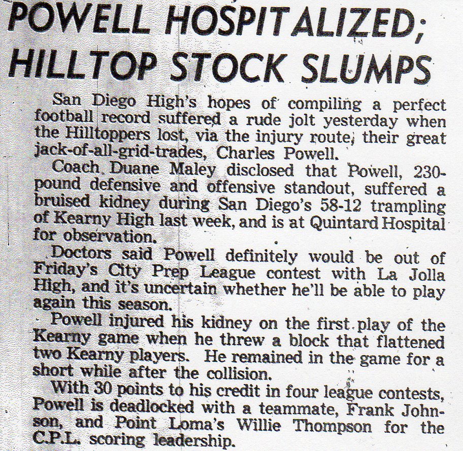 End Charlie Powell, who would be named Southern California player of the year, sustained a bruised kidney after taking a knee in his back during a 58-12 romp over Kearny, the poorest team on the schedule.