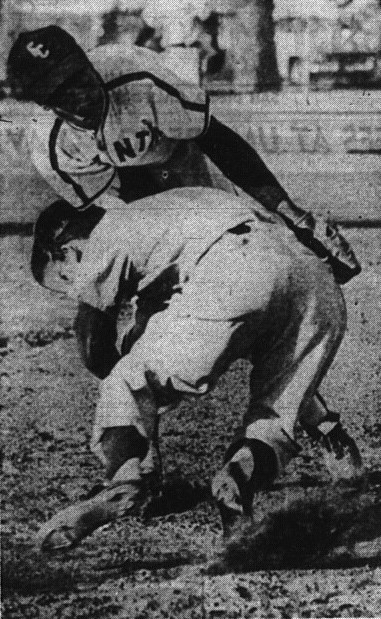 Mission Bay’s Stan Gilliland drove a pitch into right field for what appeared to be a certain base hit in the sixth inning. Hoover’s Bob Steel, playing shallow, fielded the ball on a hop and threw out Gilliland.