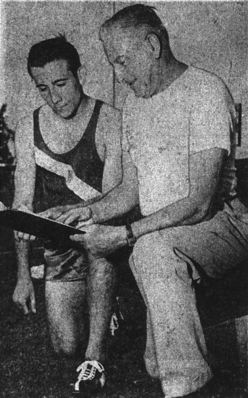 Bob Vezza won the 100 in :10, 220 in :22, and advanced the school record to 22 feet, 6 inches, in the broad jump, and ran a leg in the relay. Vezza, Jack Wilson, and Larry Aiken staked Charles Hahn to a 10-yard lead at start of the relay anchor leg.