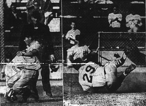 Trailing, 4-1, in the last of the seventh inning, San Diego got a triple from Clarence Calvin, double from Dennis Maley, bunt single by Louie Panza, pinch-hit single by Lee Wright, Hoover error, and a double steal that stole the win from the stunned Cardinals.