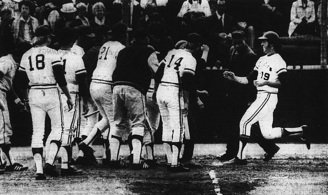 —Steele, who was on base after being hit by Patrick Henry hurler Andy Bertrem, admitted later that he had been hit by Tronerud’s grounder.