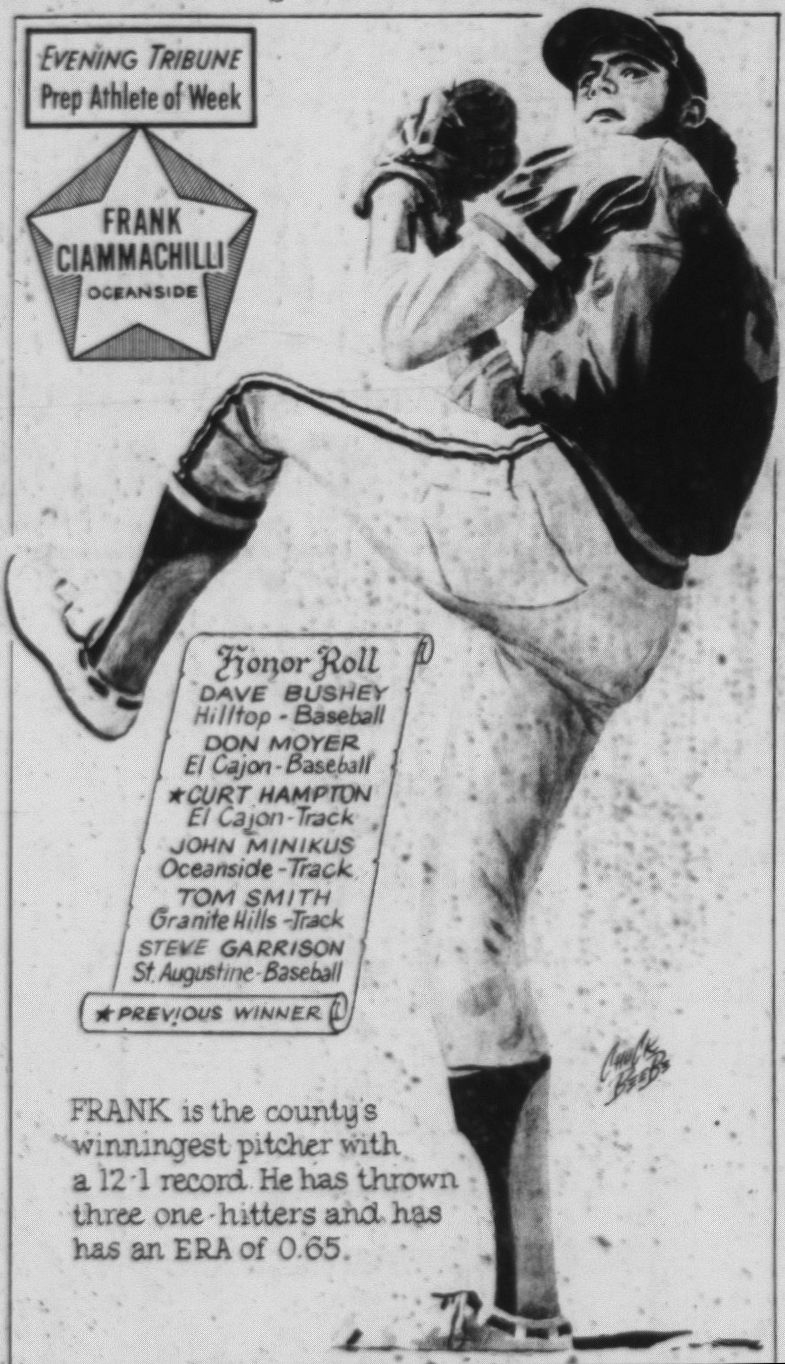 Oceanside’s Frank Ciammachilli was 12-1 and his earned-run average 0.65 after Ciammachilli’s four-hitter defeated Vista, 4-0, and the Pirates clinched a second straight Avocado League championship.