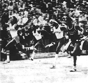 —Patrick staggered to the end in the mile relay and collapsed at the finish line—“I just pooped out,”—he told Nick Canepa of the Evening Tribune, although Lincoln’s 3:21.6 matched that of the 1-2 teams, Morse and Crawford.