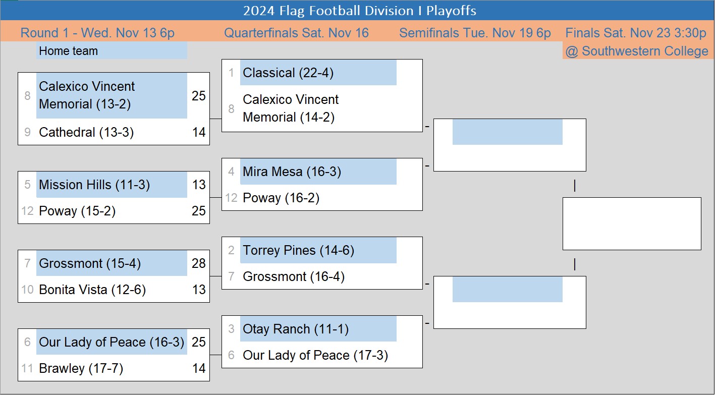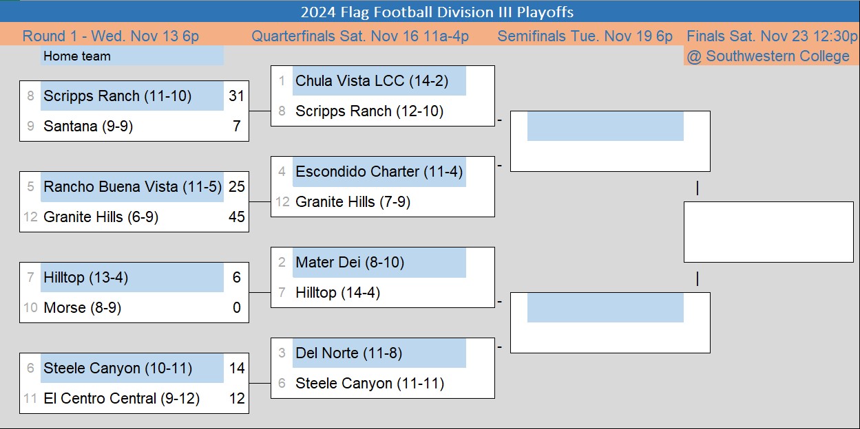 Peaking for the playoffs is D-I No. 12 seed Poway as they bested 5 Mission Hills to face 4 Mira Mesa, while D-II No. 11 San Dieguito topped 6 Patrick Henry, then 3 San Marcos, to earn a semifinal with 2 Westview. In D-III, No. 12 Granite Hills upset 5 Rancho Buena Vista, and now meets 4 Escondido Charter. The rest of the brackets held close to form.