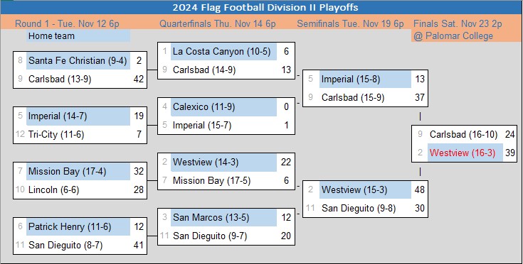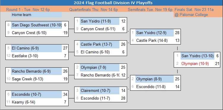 Division IV— Olympian (10-9) topped San Ysidro, 21-6, with two TD passes from QB Jaiden Liera to Aubrey Tbayan.