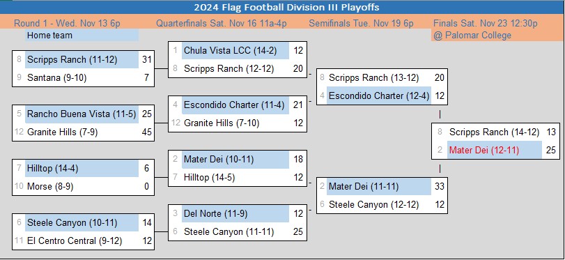 Division III— Mater Dei (12-11) played tough defense with four interceptions, to top Scripps Ranch, 25-13. The Crusaders had a sub .500 season, but ended the regular season 4-4 against teams that made the playoffs, and then 3-0 for the title.