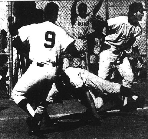 The Cardinals’ Charlie Johnson singled to right field with one out in the top of the seventh inning and advanced to second base after pitcher Bill Oxidine threw wildly on a pickoff attempt.