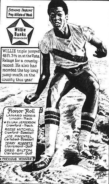 —Oceanside’s Willie Banks, nursing a hip problem, missed in the 120 high hurdles and long jump, the latter in which Banks was defending champion, but qualified with one jump at 44-7 in the new event triple jump, won by El Capitan’s Bill Tobert at 45-0 ½.