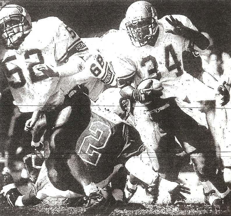 Castle Park freshman linebacker Zeke Moreno did not pass age-eligibility to play football until near the end of the season…Moreno finally got his chance and had 13 tackles in a playoff loss to El Capitan…Dick Huddleston also was captain of the 1961 Escondido team and played collegiately at Cal Western University…Mission Bay’s 21-17 victory was its first over Lincoln since 1973 and ended a string of six losses in a row to the Hornets…his life would end prematurely in an auto accident after playing for the Los Angeles Raiders, but, for now, there was unlimited promise for St. Augustine’s Darrell Russell, a 6-foot, 5-inch, 280-pound defensive tackle who also was a standout on the Saints’ basketball squad…Rancho Bernardo’s 21-6 win over Monte Vista marked dedication of the Broncos’ stadium…CIF officials ratified in February a long-discussed and ping ponged decision by the Coordinating Committee and Board of Managers to drop the 3-A, 2-A, 1-A designation for football playoffs in favor of I, II, III, and IV….